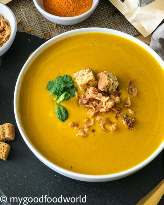This Vegan Curried Pumpkin Soup is super creamy, smooth, and full of flavor! This easy pumpkin soup is gluten-free, paleo, dairy-free, low-carb, and keto-friendly. It’s healthy and quick to make with canned pumpkin puree, creamy coconut milk, and curry spices! You’ll have a satisfying cozy meal ready in 15 minutes!