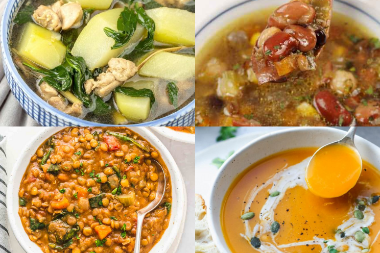 Clockwise from top left: Chicken tinola, Instant pot bean soup, Slow cooker butternut squash soup, Instant Pot lentil soup