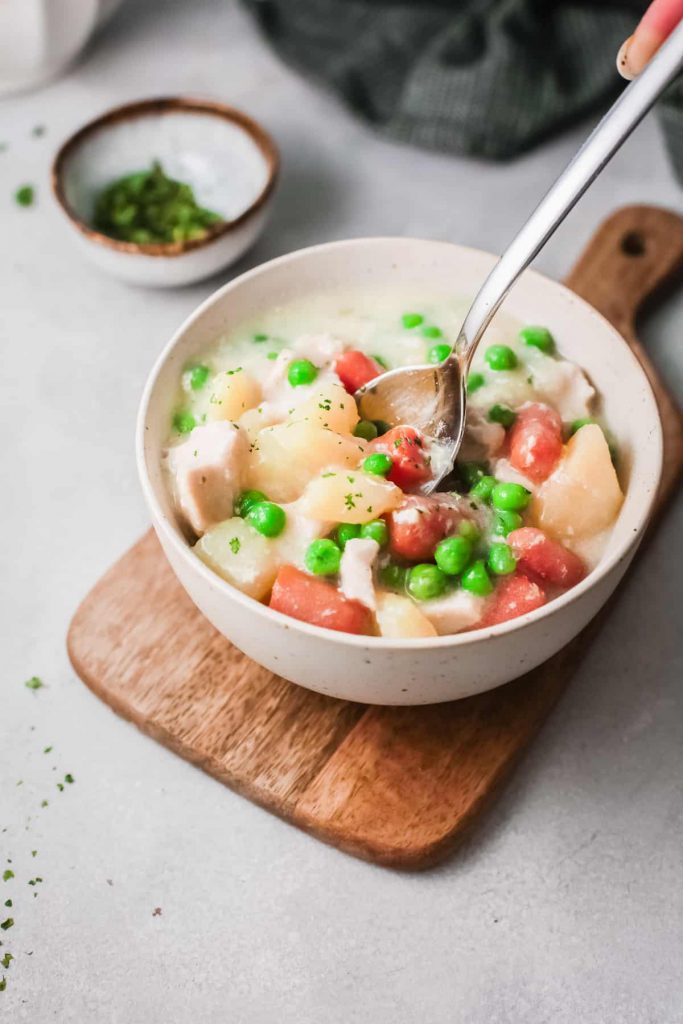 This dump and start crockpot chicken pot pie recipe is so easy to prep and even easier to cook. Yeap, you just set it and forget it! Toss in the carrots and peas in the last few minutes, and some leftover biscuits and serve. It’s perfect for busy breastfeeding mom or busy evenings when you are craving home-cooked comfort food.